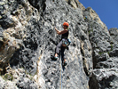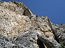 Terzo tiro Bella parete strapiombante nella prima parte, poi per facili roccie fino alla sosta con chiodo cementato della via delle Guide, dove si consiglia di sostare per evitare che la corda faccia molto attrito.