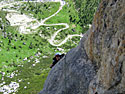 Impegnativo anche il muro verticale del terzo tiro: dei buchetti provvidenziali permettono l'arrampicata libera.