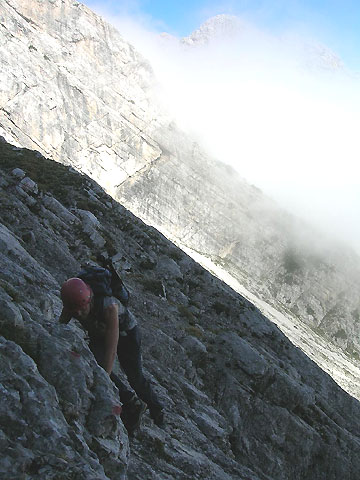 Salita verso la forcella dei Cacciatori dalla val del Drap sui lastroni dei Preti