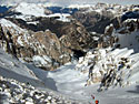 I problemi cominciano quasi subito quando si tratta di risalire il canalino che permette di accedere al ghiacciaio: 10-20 cm di neve fresca, caduti nella notte, si attaccano "gioiosamente" alle pelli formando uno zoccolo consistente. Togliere gli sci non conviene, si sprofonda...