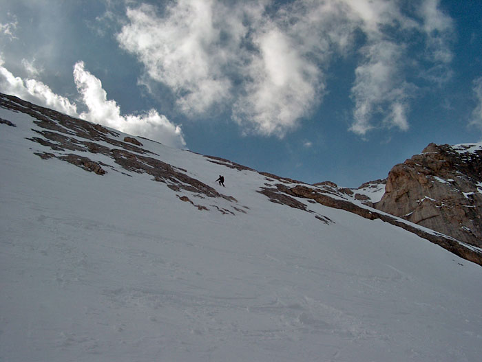 Marmolada. Discesa dalla cima del Piccolo Vernel 3098m: il tratto più impegnativo.